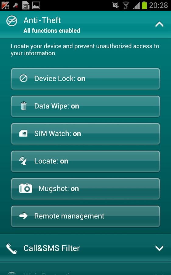 Kaspersky Mobile Security merupakan Antivirus yang dapat melindungi ponsel android Anda dari serangan Virus, Spam, Program jahat, dan lain-lain. Selain itu, Di dalam Antivirus ini juga ada fitur-fitur keren lainnya loh, seperti Anti Theft Protection, Call & Sms Filter , dan Privacy Protection.